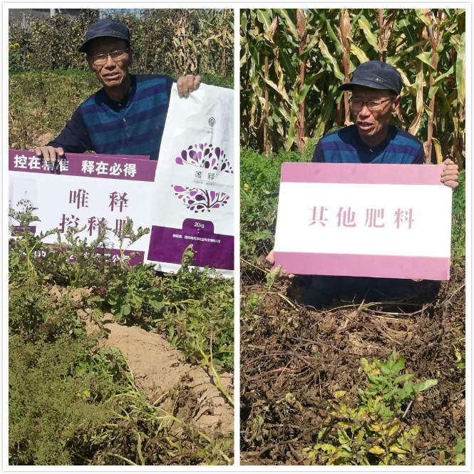 真是不比不知道,一比吓一跳。使用唯释控释肥种植的马铃薯个头大、形状好、均匀、表皮光亮、商品率极高。而使用其他肥料区域的马铃薯个头较小,形状不均匀、色泽均匀度低。唯释控释肥真正做到长效控释,大幅度提高养分利用率,满足作物生长期对养分的需要,增产增收。